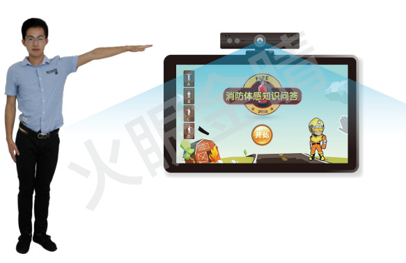 消防體感知識問答系統(tǒng)是基于KINECT體感互動技術(shù)的知識問答游戲,是對傳統(tǒng)問答方式的再創(chuàng)新。本系統(tǒng)通過體驗者的肢體動作實現(xiàn)對不同答案結(jié)果的選擇,答題結(jié)束會給出系統(tǒng)評分、競技排名等信息。每一位體驗者在充分娛樂的同時又能學(xué)習(xí)到各類消防安全知識,是一種全新的教育體驗方式。