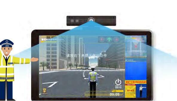模擬交通指揮體驗系統(tǒng)是一款體感游戲產(chǎn)品。模擬真實的交通運行場景,利用體感游戲設(shè)備,識別用戶的肢體動作。根據(jù)屏幕中設(shè)定變化的交通信號燈以及相對應(yīng)的交通指揮動作,來控制游戲中的交警,完成游戲中運行的車輛指揮任務(wù),身臨其境的體驗交通指揮。